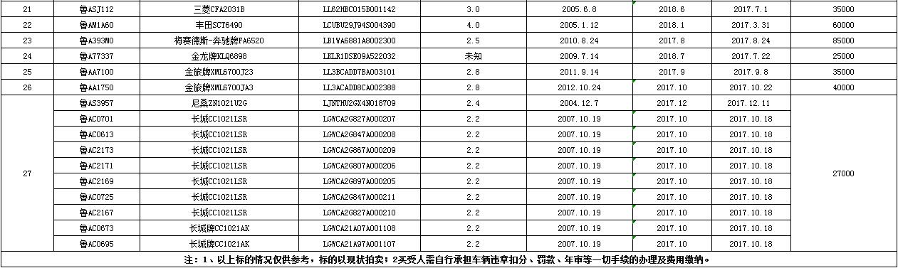 意向競買者請于2017年8月27日16:00之前將拍賣保證金10000元/輛交至以下賬戶(戶名:金諾國際拍賣有限公司,開戶行:齊魯銀行濟南歷城支行,賬號:000000726003800003937),準備有效身份證明(個人:身份證原件及復印件;法人:營業(yè)執(zhí)照復印件)聯(lián)系本公司辦理競買登記。