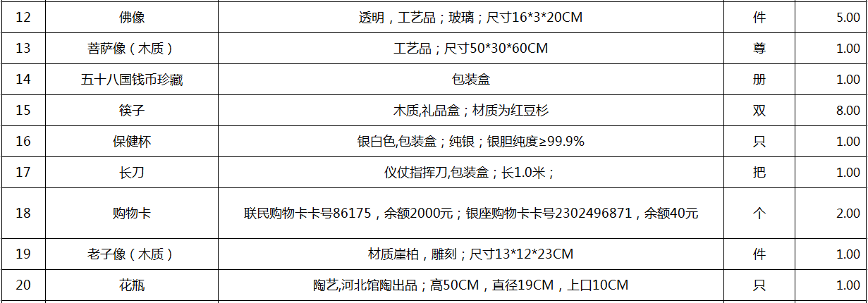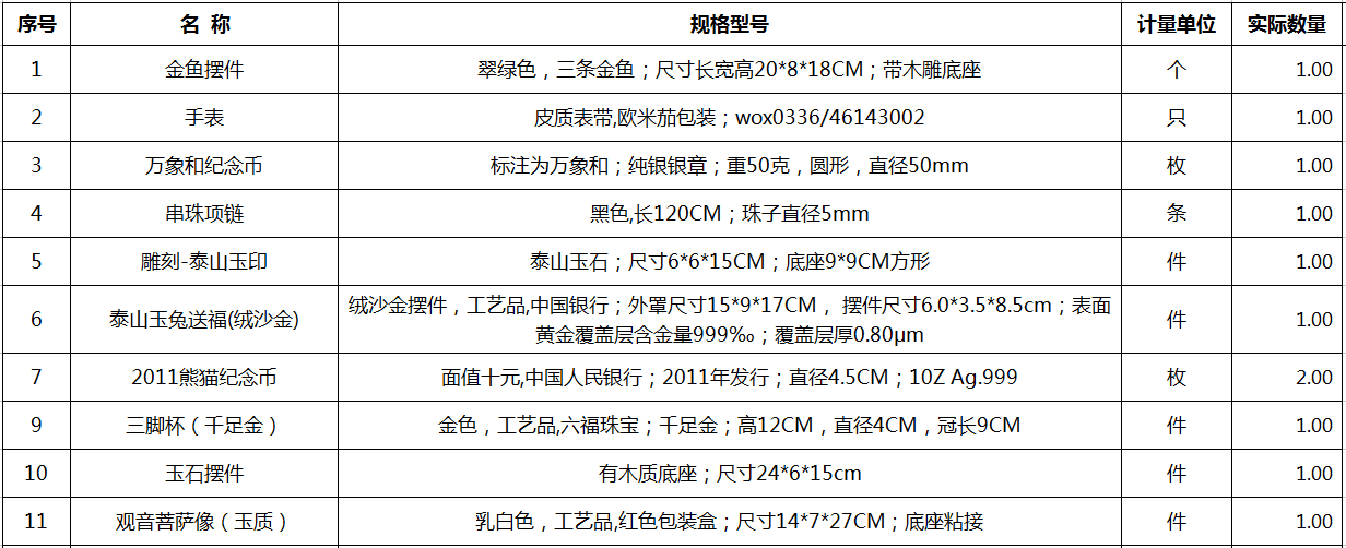 9、存貨物品一宗(包括木質(zhì)雕刻類、玉石擺件類等),詳見清單。參考價18.1萬元,保證金3萬元。
